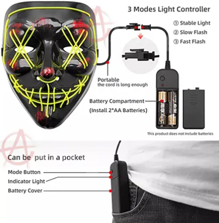 6.INSTRUCCIONES---Debe agregar dos baterías AA (las baterías se proporcionan por sí mismo, tenga cuidado de no instalar la batería inversa, la batería está invertida, la máscara no brillará), y luego presione el botón, la máscara se iluminará.